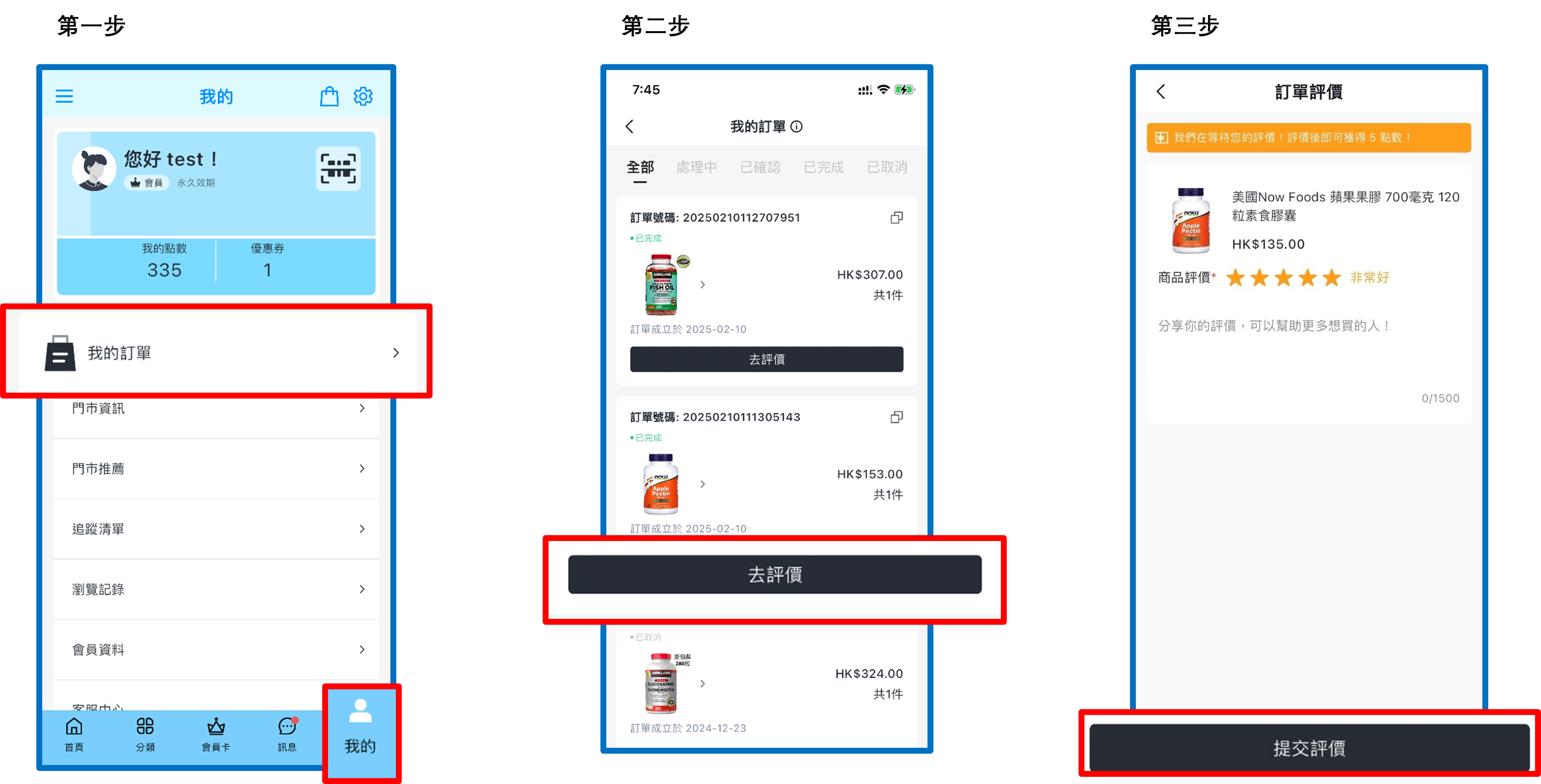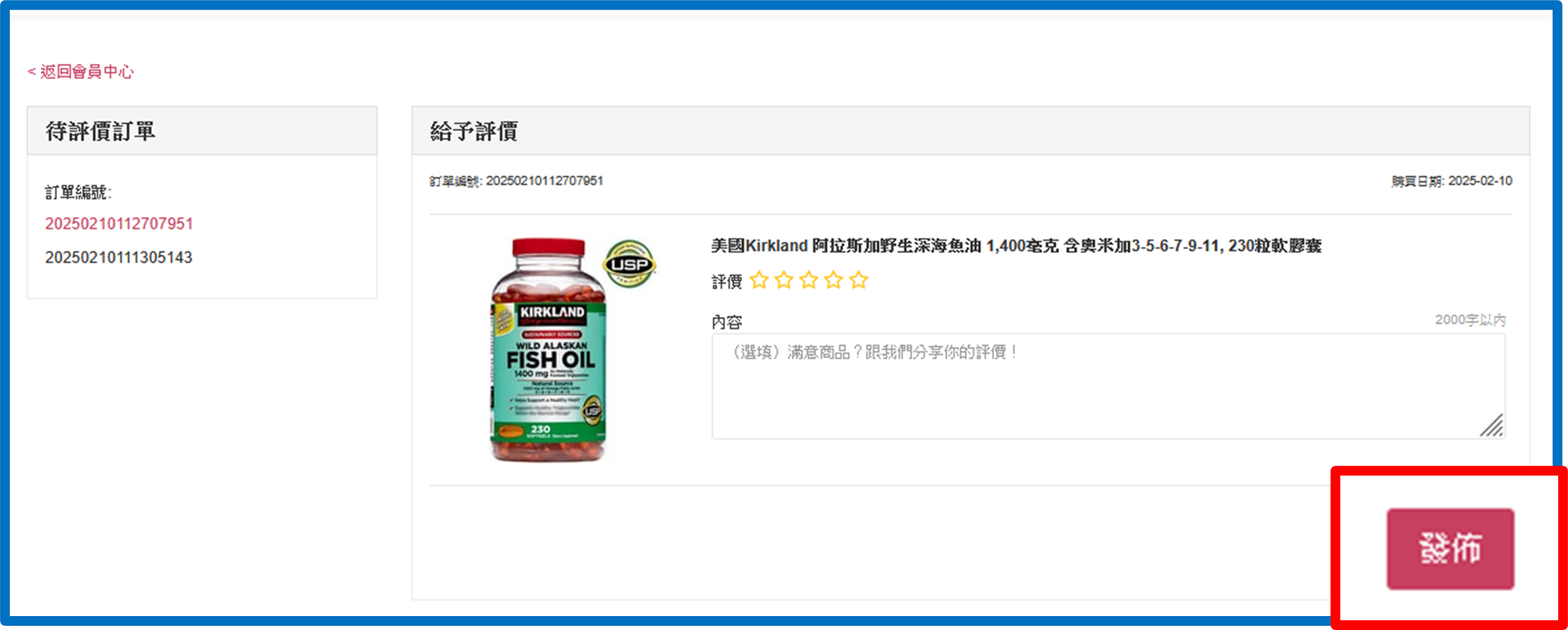 1. 在訂單狀態顯示為已完成的訂單,點擊 “ 去評價 ”