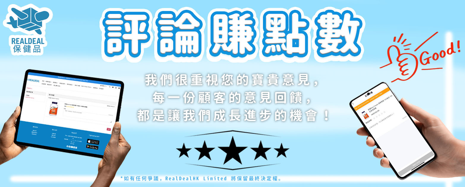 顧客登入為會員或注冊成爲會員,成功於RealDeal旺角門市,RealDeal官網或RealDeal APP完成訂單並付款。提交該訂單的所有產品評價和評論,即可賺取5個點數。